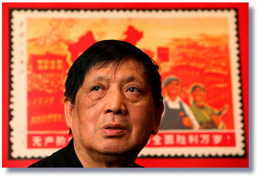 Le graveur WANG Wei-sheng pose devant le timbre fautif, à Hong Kong en 2009