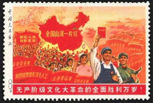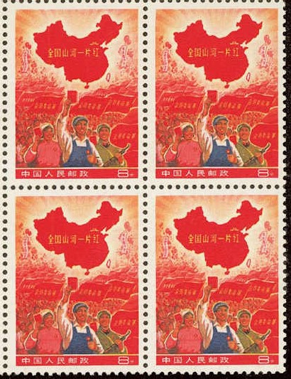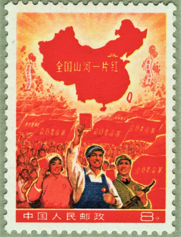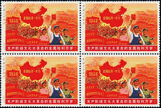 Tous les artistes – au moins ceux qui n’ont pas disparu dans la furie destructrice de la Révolution culturelle, sont sollicités pour mettre le Petit livre en avant. Le graveur de timbres WAN Wei-sheng1 est alors requis en 1968 pour une série de vignettes philatéliques illustrant le slogan « Toute la Chine est rouge ! ». Le 23 novembre 1968, l’administration des Postes met donc en vente deux vignettes d’une valeur faciale de 8 fen, l’une verticale, l’autre horizontale. Au premier plan, un ouvrier en salopette brandit le Petit livre rouge, avec à ses côtés un soldat de l’APL, une ouvrière, et derrière lui une foule enthousiaste également munie du bréviaire maoïste, avec force drapeaux rouges et banderoles, et citations de Mao. Dominant le tout, une carte de la Chine populaire, marquée du slogan «Toute la Chine est rouge ! » .