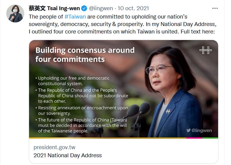 Quelques jours après la publication du texte de Mme TSAI dans Foreign Affairs, et la présidente taïwanaise, et le dirigeant communiste XI, ont chacun prononcé un discours à l’occasion du 10 octobre (le Double-Dix), commémoration du soulèvement de 1911 qui a entraîné la chute de la dynastie mandchoue des Qing (1644-1911), et mené à la proclamation officielle de la République de Chine le 1er janvier 1912, avec SUN Yat-sen (1866-1925) à sa tête1.