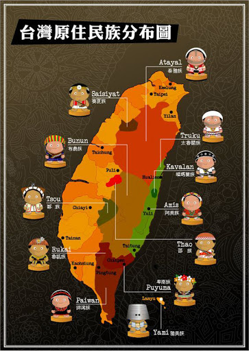 Les écrits des missionnaires catholiques (à partir du XVIIe siècle) et protestants (avec l’arrivée des Hollandais, mais surtout à partir du XIXe siècle et des missions anglo-américaines particulièrement actives), puis les recherches anthropologiques japonaises et américaines au XXe siècle ont permis de relever l’existence de 16 peuples sur l’archipel, des groupes de taille très variable. Leur histoire est celle d’un long refoulement des plaines littorales occidentales où ils étaient initialement installés vers les montagnes du centre et de l’est[4]. Ce refoulement est d’abord le fait des colons hollandais, qui ont importé une main-d’oeuvre chinoise continentale pour travailler les terres littorales, tout en entretenant des rapports de troc avec les Aborigènes (en particulier pour se procurer les peaux de daims, particulièrement recherchées). Les Hollandais partis, ce sont les populations han qui ont maltraité les Aborigènes en les dépossédant de leurs terres d’origine. Et, là comme ailleurs, le refoulement économique et sociétal a été conflictuel et violent. La présence aborigène dans les plaines est devenue marginale, et les collines de piémont ont été disputées. Les autorités chinoises de la dynastie Qing (à partir du XVIIe siècle) décrètent en 1739 une ligne de démarcation avec les Aborigènes, qui restera en vigueur jusqu’en 1875. Sauf autorisation, les populations chinoises du littorales sont interdites d’accès sur les territoires des « Barbares des montagnes ». Cette ligne de démarcation apparaît sur les cartes de l’île jusqu’à la fin du XIXe siècle.