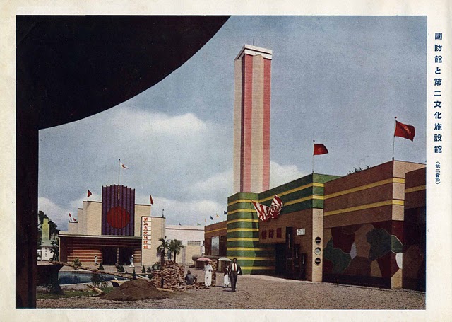 Les pavillons présentent toutes les productions agricoles et industrielles de la colonie, et sa richesse culturelle (via les salles de théâtre et de cinéma). Les réalisations depuis 1895 sont mises en valeur (chemin de fer et transports, postes, urbanisme, éducation, promotion du tourisme, etc.) Des pavillons et des salles sont consacrés au Japon entre tradition (Kyoto ; les femmes en kimonos) et modernité (Tokyo ; les hommes en costumes occidentaux ; plusieurs pavillons régionaux, et de grandes entreprises industrielles de la métropole). D’autres sont consacrées à l’armée, et aux matériels militaires. Mais sont également présentées les deux autres colonies de l’Empire : la Corée et le Mandchokuo8. A l’instar d’autres expositions impériales, dont bien sûr l’Exposition coloniale française de 1931, des « villages indigènes » ou « villages anthropologiques » exhibant des « primitifs, sauvages vivants» en costumes « authentiques », dans leurs paillotes, à civiliser encore9.