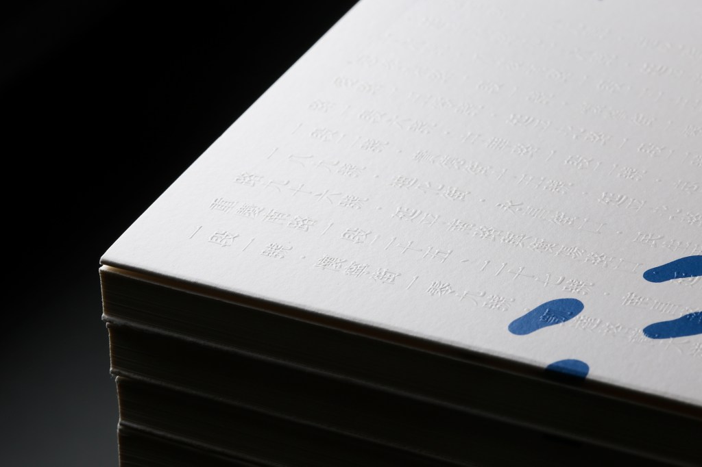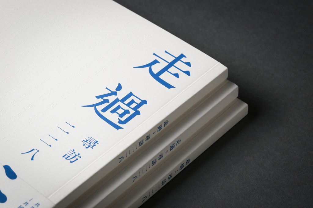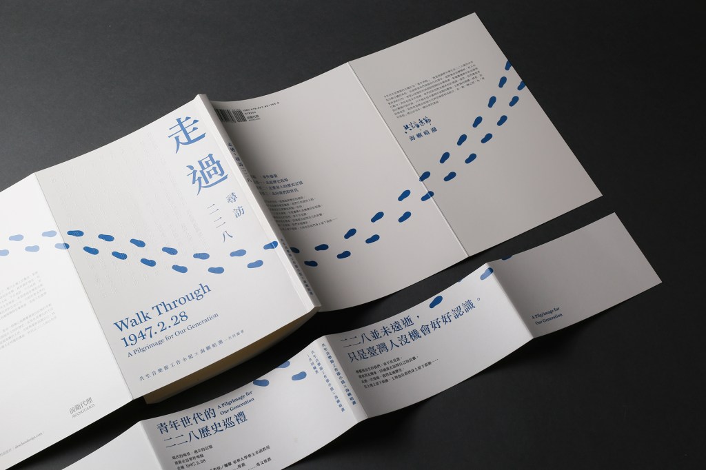 Faute d’avoir vu ou lu ce livret, nous pouvons au moins souligner la très grande qualité graphique de la maquette de couverture, sobre mais d’une grande lisibilité symbolique. Elle est due au jeune designer Alex CHEN. Il explique avoir voulu représenter un voyage, une itinérance. Par des empreintes de pied sur une couverture embossée d’idéogrammes en relief mais non imprimés : dans le mouvement visuel de la couverture, l’idée est donc bien celle du pèlerinage mémorial.
