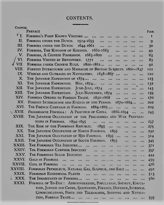 DAVIDSON James Wheeler (1872-1933), The Island of Formosa, Past and Present. History, People, Resources, and Commercial Prospects : tea, camphor, sugar, gold, coal, sulphur, economical plants, and other productions, 1903, London and New York, Macmillan, 692p. , p.279-280. Cf.https://books.google.fr/books/The_Island_of_Formosa_Past_and_Present