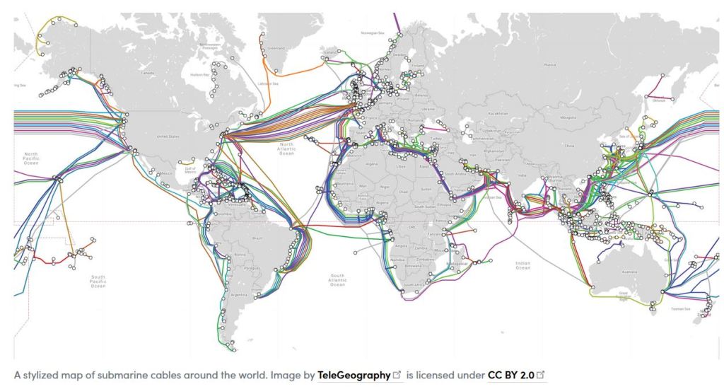 Les câbles de communication sous-marins sont l’infrastructure essentielle de l’ère numérique. 99 % de toutes les communications numériques transocéaniques (échanges internet, stockage cloud, transactions financières, e-mails, messagerie vocale, etc.) sont acheminées par des câbles sous-marins à fibre optique1. Malgré le développement des technologie satellitaires, les câbles sous-marins restent le moyen le plus rapide, le plus efficace et le moins coûteux d’envoyer des informations numériques à travers le monde dans un avenir prévisible. Le réseau mondial des quelques 500 câbles sous-marins (pour 1,3 millions de kilomètres) est donc une infrastructure stratégique critique2.