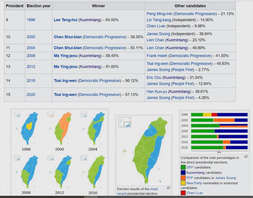 * Jusqu’en 1996, les présidents et vice-présidents sont élus au scrutin indirect par le Yuan législatif (ainsi le président LEE en 1988). La réélection du président LEE en 1996 s’est alors déroulée au suffrage universel direct. Sept présidents (dont la présidente TSAI en 2016 et 2020) et vice-présidents ont ainsi été élus au suffrage universel direct depuis 1996. Tous les présidents ont accompli deux mandats. Les candidats à la présidence et leurs colistiers à la vice-présidence sont élus sur un même ticket, au scrutin uninominal à un tour. Les candidat.e.s doivent être citoyens de la République de Chine, âgé.e.s d’au moins 40 ans, et résider à Taïwan depuis au moins 15 ans. Ne peuvent être candidats : les militaires ; les détenteurs d’une autre nationalité ou devenus Taïwanais par naturalisation; les résidents en République populaire de Chine.