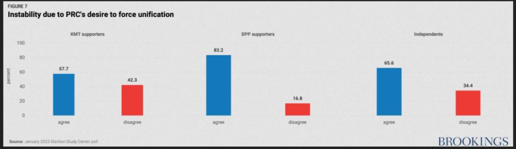 Une des leçons de cette enquête semble être que le rapprochement accentué de TSAI Ing-wen vers Washington (qui a culminé avec la visite de Nancy Pelosi) suscite une certaine inquiétude en dehors de son propre camp (le DPP, le camp Vert), que ce soit chez les partisans du Kuomintang ou chez les indépendants. Ce rapprochement, attaqué au quotidien par Pékin, est jugé susceptible d’accroître les tensions, et donc l’insécurité par l’île.