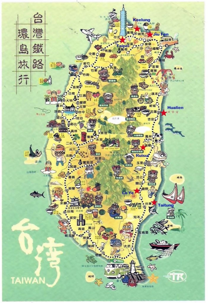 Titrée « Illustrated map of Taiwan for tourist », elle figure les monuments symboliques les plus importants (à Taipei, le palais présidentiel de la République de Chine, en briques rouges ; les grands temples en province), les principales productions économiques (en particulier agricoles : ananas, bananes, sucre, riz, pastèques, etc), et les sites les plus remarquables (les « scenic spots », en particulier dans la montagne, et dans les régions à populations aborigènes).