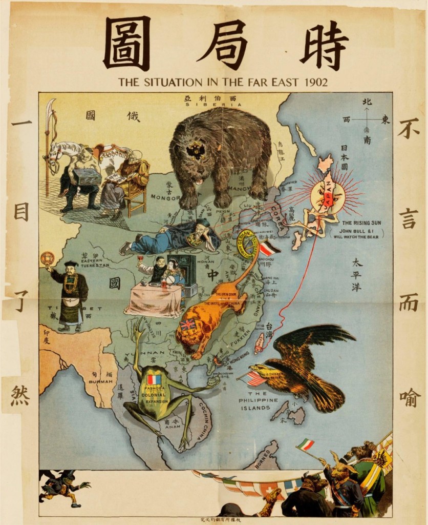 En 1899, il publie «時局全圖 – The Situation in the Far East [ La situation en Extrême-Orient]2 » un pamphlet dénonçant les visées impérialistes sur la Chine, dirigée par une dynastie Qing incompétente et corrompue. Son texte est illustré de la première version, en noir et blanc d’abord, puis en couleurs, d’une carte allégorique où les Puissances sont représentées par des animaux. A partir de modèles anglais de la fin du XVIIIe siècle et de la période napoléonienne, de telles allégories animales sont fréquentes au XIXe siècle sur des cartes européennes et japonaises : le coq (ou la grenouille, chez les Anglo-Saxons qui se moquent des froggies) français ; l’ours (ou la pieuvre) russe ; le bouledogue (ou le lion) britannique ; le tigre chinois ; le pygargue américain, etc.