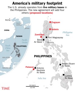 En 1998 est donc signé un Visiting Forces Agreement (VFA), un nouvel accord qui permet « des visites temporaires de troupes américaines ». Et, en 2012, Manille accorde à Washington le droit d’utiliser des bases philippines, principalement lors des manœuvres annuelles conjointes bi- ou multi-nationales. En 2014, sous la présidence Obama, l’Accord de coopération renforcée en matière de défense (Enhanced Defense Cooperation Arrangement, EDCA) entérine l’usage « non permanent » par les forces armées américaines et « conjointement avec l’armée philippine » de cinq bases philippines modernisées. Car les tensions montent en mer de Chine méridionale, où Pékin affirme de plus en plus sa présence, et autour de Taïwan : Manille se heurte frontalement à cette présence chinoise dans ses eaux proches et sa ZEE.