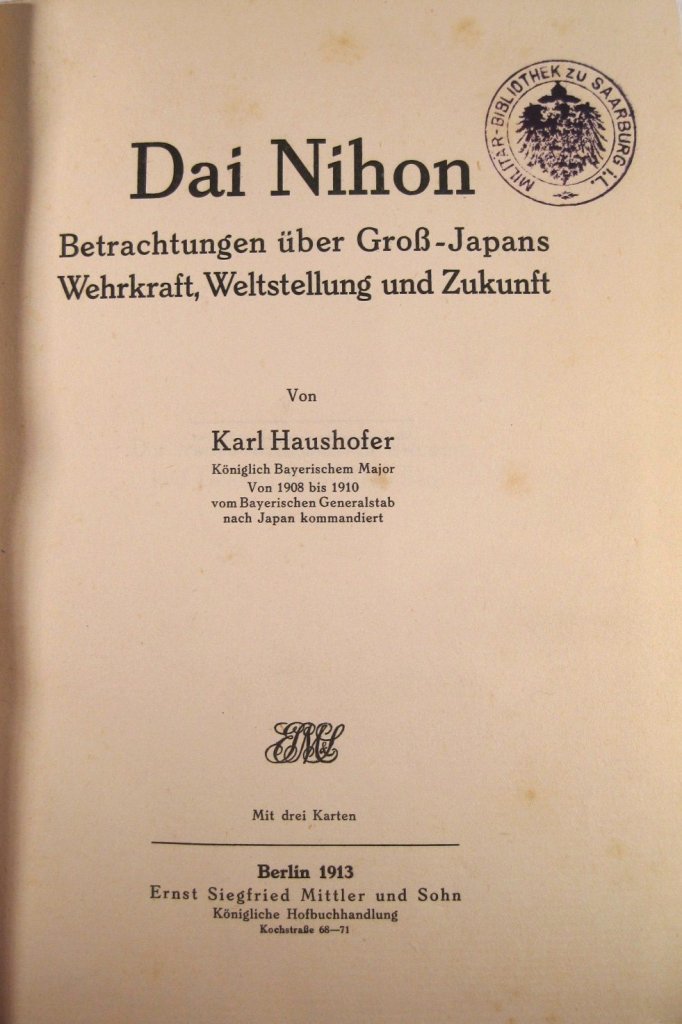 HAUSHOFER Karl Ernst, Dai Nihon. Betrachtungen über Groß-Japans Wehrkraft, Weltstellung und Zukunft [Réflexions sur la puissance militaire du Grand Japon, sa position mondiale et son avenir], Berlin, Mittler und Sohn, 1913, 378p. > En pdf. : https://ia802900.us.archive.org/32/items/KarlHaushofer.pdf