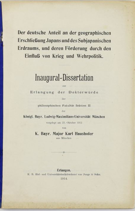 HAUSHOFER Karl, Der deutsche Anteil und der geographischen Erschließung Japans und des Subjapanischen Erdraums, und deren Förderung durch den Einfluß von Krieg und Wehrpolitik, Doktorwürde Inaugural-Dissertation, München 1913, Erlangen, 1914, 110p.. Cf. https://www.schierenberg.nl/product/49979