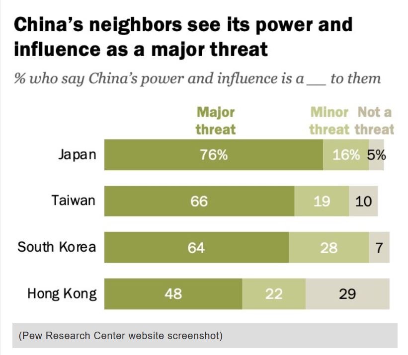 Parmi les quatre pays étudiés, le Japon a le pourcentage le plus élevé de personnes décrivant la puissance et l’influence de la Chine comme « une menace majeure », soit 76 %. Viennent ensuite Taïwan avec 66 %, la Corée du Sud avec 64 % et Hong Kong avec 48 %. Pour le Japon, il s’agit d’une augmentation par rapport aux 74 % qui partageaient ce point de vue une décennie auparavant. Sur le temps long, la perception de la Chine chez les Japonais est d’ailleurs de plus en plus négative. Dans les quatre pays considérés, l’image est de plus en plus négative chez les jeunes, et quand on monte dans le niveau d’éducation.