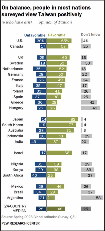 HUANG Christine, CLANCY Laura, « Taiwan seen more favorably than not across 24 countries » Washington D.C., Pew Research Center, August 11, 2023. URL : https://www.pewresearch.org/short-reads/2023/08/11/taiwan-seen-more-favorably-than-not-across-24-countries/