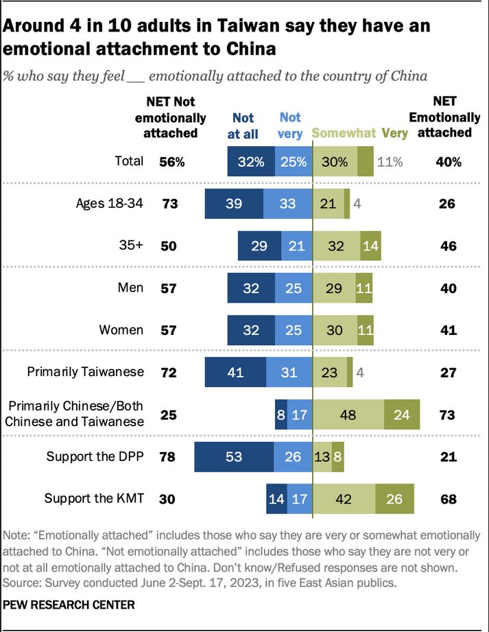 L’enquête a posé la question de « l’attachement émotionnel (emotional attachment) » – une notion dont on peut comprendre intuitivement le sens, mais qui aurait sans doute mérité d’être sociologiquement et politiquement définie plus précisément. En ce qui concerne « l’attachement émotionnel à la Chine », 40 % des sondés déclarent avoir un « lien émotionnel » avec la Chine (dont 30 % ont déclaré être « quelque peu attachés émotionnellement à la Chine », et 11 % sont « très attachés émotionnellement »). Sans surprise, cet « attachement émotionnel » est plus probable chez les plus de 35 ans (46 % des sondés) que chez les jeunes (26 % des sondés). Les trois quarts de ceux qui déclarent « un attachement émotionnel à la Chine » se considèrent comme principalement « Chinois » ou « à la fois Chinois et Taïwanais ». Le pourcentage inverse se relève chez ceux qui considèrent comme « principalement Taïwanais » et « ne ressentent pas ce lien émotionnel ».