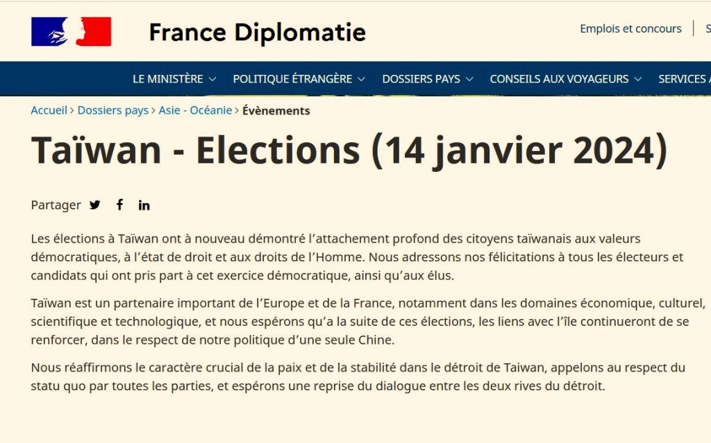 2 HARAKAWA Takao, « Congratulations to Taiwan as Foreign Minister Seeks More Nongovernment Exchanges », Japan Forward, January 17, 2024. URL: https://japan-forward.com/congratulations-to-taiwan-as-foreign-minister-seeks-more-nongovernment-exchanges/. His Holiness the Dalai Lama, « Congratulating Lai Ching-te, President-Elect, Taiwan », BDL Media, January 14, 2024. URL: https://tibetbureau.in/congratulating-lai-ching-te-president-elect-taiwan/ ; CNA, « New Delhi envoy congratulates Taiwan’s new leaders on Republic Day », Focus Taiwan, January 22, 2024 . URL: https://focustaiwan.tw/culture/202401220019