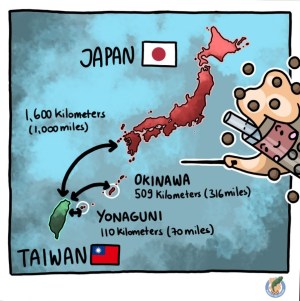 En mer de Chine orientale, l’île japonaise de Yonaguni (与那国島, Yonaguni-jima), extrémité de l’archipel Yaeyama, et située dans la préfecture d’Okinawa, est un confetti : 11km de long et 4km de large, moins de 29km2, environ 1700 résidents permanents2.