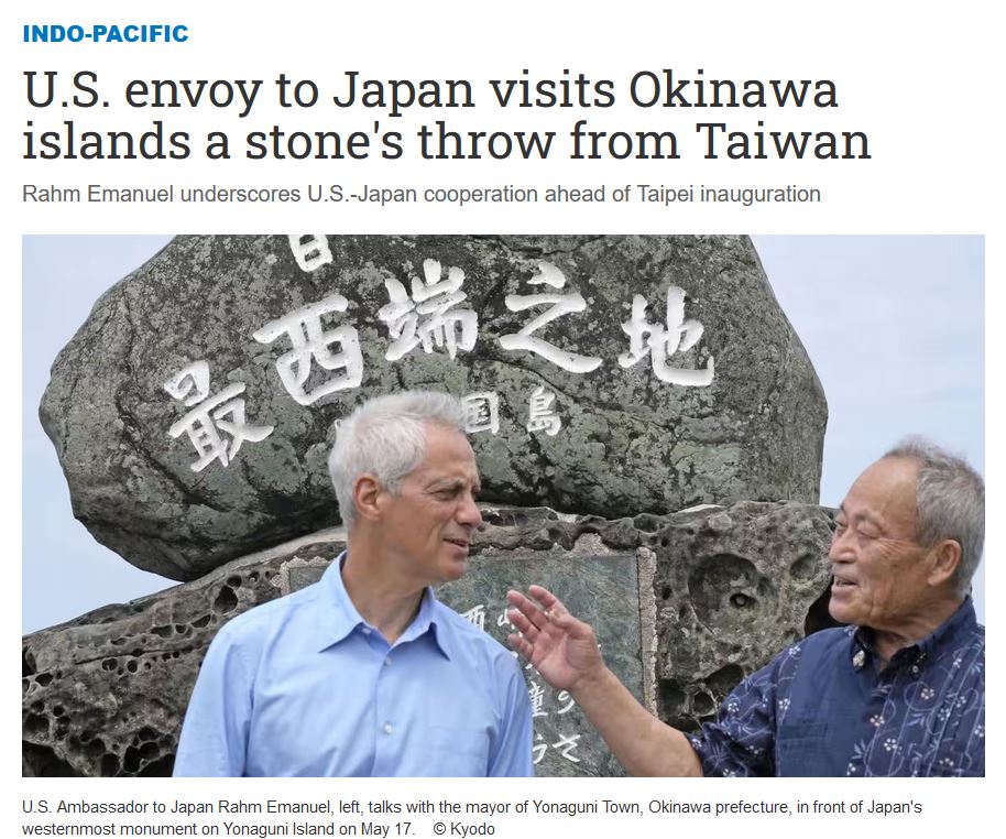 13 « U.S. forces use civilian airport for Emanuel’s visit in Okinawa », Asahi Shimbun, May 17, 2024. URL : https://www.asahi.com/ajw/articles/15270691 ; et : «U.S. envoy to Japan makes landmark visit to front-line island near Taiwan », Japan Times, May 17, 2024.URL : https://www.japantimes.co.jp/news/2024/05/17/japan/politics/rahm-emanuel-yonaguni/ C’est la première fois qu’un avion militaire américain aterrissait à Yonaguni depuis la restitution par les Américains au Japon de la souveraineté sur les Ryūkyū en 1972.