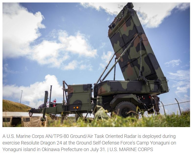 A l’occasion des manœuvres conjointes Resolute Dragon 24 d’août 2024, l’aviation japonaise a transporté à Yonaguni, au profit du 12e Régiment côtier de Marines américains (MLR) un radar de surveillance multimissions (AN/TPS-80 Ground/Air Task Oriented Radar)14. Tokyo envisage de déployer à Yonaguni début 2025 un prototype de radar « au-delà de l’horizon » (over-the-horizon radar, OTH), et qui permettrait à partir de 2029-2030 « une surveillance plus avancée des menaces aériennes et navales [chinoises] 15».