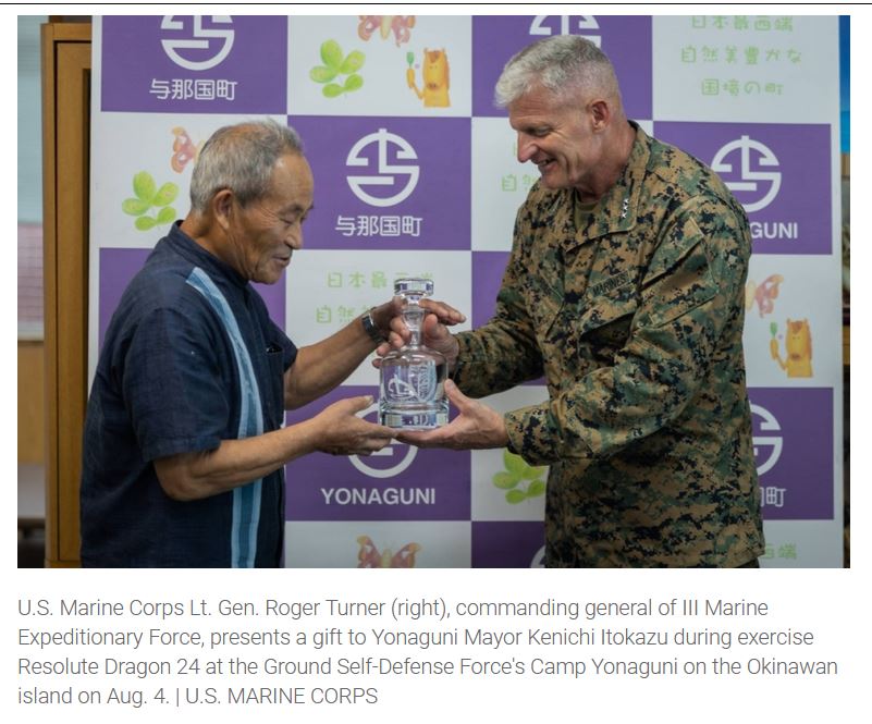 A la différence du gouverneur d’Okinawa Denny Tamaki, historiquement hostile à la présence américaine dans les îles du sud-ouest, le maire de Yonaguni, Kenichi Itokazu, élu en 2021, est notoirement pro-américain. Il a reçu sur l’île, le 17 mai 2024, Rahm Emanuel, ambassadeur des Etats-Unis au Japon depuis 2022, et le lieutenant général du Corps des Marines des États-Unis Roger Turner le 4 août, à l’occasion des manœuvres conjointes nippo-américaines Resolute Dragon 24. Il a été invité à Washington en septembre 2024. Interrogé par le Japan Times fin septembre 2024, il s’est exprimé sur une « éventualité taïwanaise » (« a Taiwan contingency ») , et les moyens à la fois de la dissuader ou, si nécessaire, d’y répondre. « Une éventualité taïwanaise [le risque d’un conflit] doit être dissuadée à tout prix, mais pour ce faire, nous devons être bien préparés à la dissuader.25» Il se déclare opposé à la politique américaine d’« ambiguïté stratégique » vis-à-vis de Taïwan26– mais Tokyo maintient de fait politique d’ambiguïté identique à celle de Washington. Itokazu envisage même que l’armée taïwanaise pourrait se joindre aux exercises nippo-américains sur l’île27. On en est encore loin28…