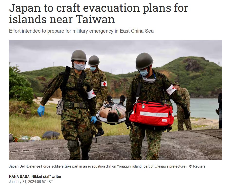 Plus récemment, « en prévision de situations comme une urgence à Taïwan », Tokyo a décidé de construire des « abris de protection civile » dans les îles Sakishima, dont Yonaguni, avec des réserves de nourriture pour deux semaines et du matériel de communication21. Dans un premier temps sont concernées les îles de Yonaguni, Ishigaki, Miyakojima, Taketomi, et Tarama. Et comme toutes les autres îles japonaises habitées des Ryūkyū, un « plan d’évacuation en cas de catastrophe ou de conflit » a été présenté à la population locale et notifiés aux préfectures japonaises22. La planification prévoit que les populations des groupes d’îles des Ryūkyū les plus éloignés (donc principalement l’archipel de Sakishima) , soit au minimum 120000 personnes, seront ventilés entre différentes préfectures du sud du Japon, principalement dans l’île de Kyushu (Fukuoka, Kumamoto, Kagoshima, Miyazaki, Nagazaki, etc.). Les habitants de Yonaguni seront ainsi évacués dans la préfecture de Saga. Un exercice de défense civile a été organisé à Yonaguni en mai 2024 23. Le principal cas de figure mis en avant par les autorités est celui d’un violent tremblement de terre dans la région suivi d’un tsunami ; mais tout les habitants ont bien perçu que c’était l’hypothèse d’un conflit majeur à Taïwan (« in the event of a Taiwan contingency ») qui justifiait ces plans d’évacuation. Pour Pékin, la construction de ces abris « ne peut qu’exacerber les tensions régionales à l’heure du 80e anniversaire de la victoire de la Chine contre l’agression impérialiste japonaise [débutée en 1931] », qui sera commémorée en septembre 2025.