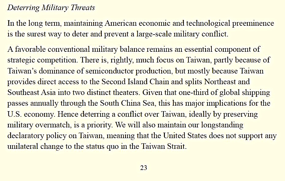 Dans la National Security Strategy (NSS 2025) publiée en novembre 2025, Taïwan occupe une place significative dans la section sur « la concurrence stratégique et la sécurité en Indo-Pacifique. » Taïwan est mentionnée à plusieurs reprises au cœur de la stratégie indo-pacifique des États-Unis, impliquée dans l’économie mondiale, la stabilité des routes maritimes, et la sécurité régionale. Le texte met l’accent sur l’importance stratégique de Taïwan du fait de sa position géographique-clé dans les « première et deuxième chaînes d’îles » ; ainsi que son rôle dans les chaînes d’approvisionnement mondiales, et notamment les semi-conducteurs. Le document affirme que « prévenir un conflit » dans le détroit de Taïwan, idéalement « en préservant une supériorité militaire (military overmatch) », est une priorité. Il réaffirme aussi l’engagement à maintenir la politique traditionnelle des États-Unis, selon laquelle Washington « ne soutient aucun changement unilatéral du statu quo dans le détroit de Taïwan. » Le texte appelle les alliés de la première chaîne insulaire (Japon, Corée du Sud, autres partenaires de l’Indo-Pacifique) à renforcer leurs propres capacités de défense et à collaborer plus étroitement pour dissuader toute agression, soulignant que les États-Unis ne peuvent pas assumer seuls cette responsabilité.