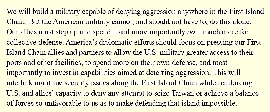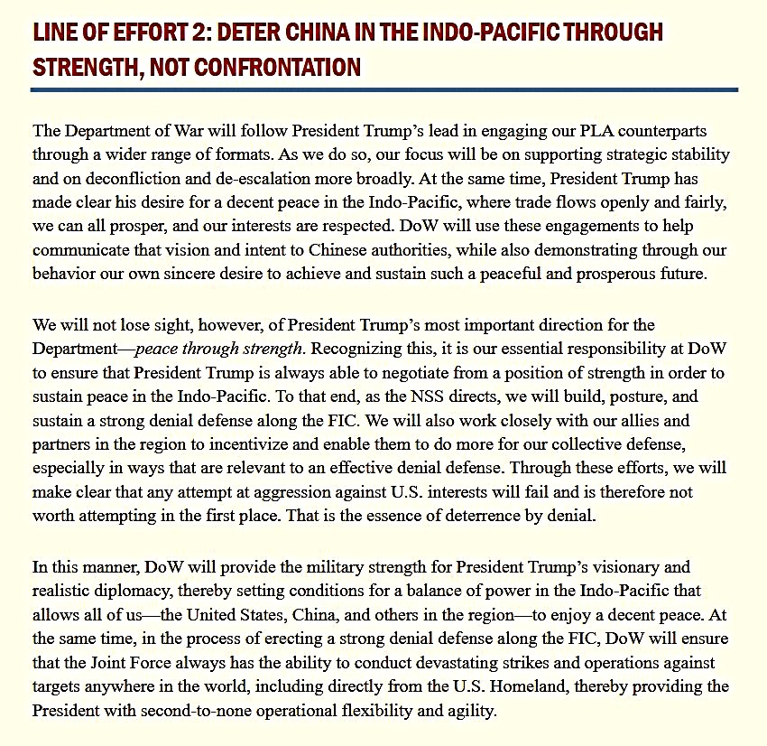 Dans la National Defense Strategy (NDS 2026) publiée le 23 janvier 2026, le mot « Taïwan » n’apparaît nulle part. Le document met l’accent sur la défense intérieure et extérieure du territoire américain et la sécurité de l’hémisphère occidental comme priorités absolues, reléguant les engagements extérieurs à des collaborations avec des alliés pour des problématiques régionales. Le texte traite de la concurrence stratégique avec la Chine dans une section sur l’Indo-Pacifique : il dit vouloir dissuader toute domination régionale de puissances rivales par la force, et soutenir une défense en profondeur le long de la « première chaîne d’îles» . Ce qui inclut Taïwan géographiquement, mais sans mentionner l’île par son nom, ni formuler d’engagement explicite sur le statu quo dans le détroit de Taïwan. L’accent est donc porté sur sur la force militaire globale et la communication militaire bilatérale avec Pékin, soulignant qu’il ne s’agit pas de « dominer la Chine » mais de maintenir un équilibre des forces propice à une « paix décente ». La NDS 2026 appelle aussi, comme la NSS 2025, à un partage accru des responsabilités avec les alliés pour la défense dans leurs régions respectives, en particulier en Asie-Pacifique.